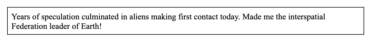 After an analysis of Earth’s curious societal structures, The Federation’s outreach team landed on the best candidate for first contact: Mr. Delon Bigger. Wielding immense power thanks to his top-ranking net worth and social influence, but also technologically savvy and having displayed a neutral-to-favorable perception of interplanetary beings, approaching him was the ideal course of action — by Earth standards, of course. They then brought in a handful of Crockleburrian consultants to confirm this and to help them identify the optimal time for engagement.